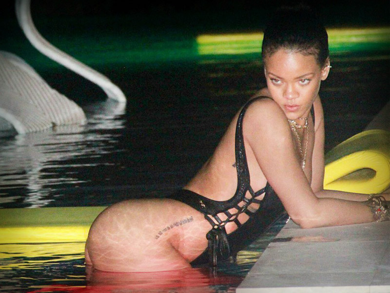 En las imágenes Rihanna luce espectacular ya sea con un bikini rojo, otro gris, otro de color rosa y flotando sobre una alberca, o por la noche con un traje de baño negro que deja al descubierto la espalda y asentúa su derrière.